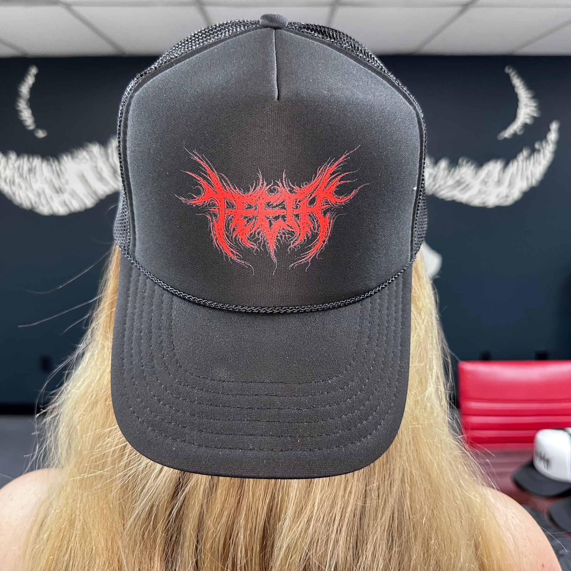 Black foam trucker cap with red Teeth logo